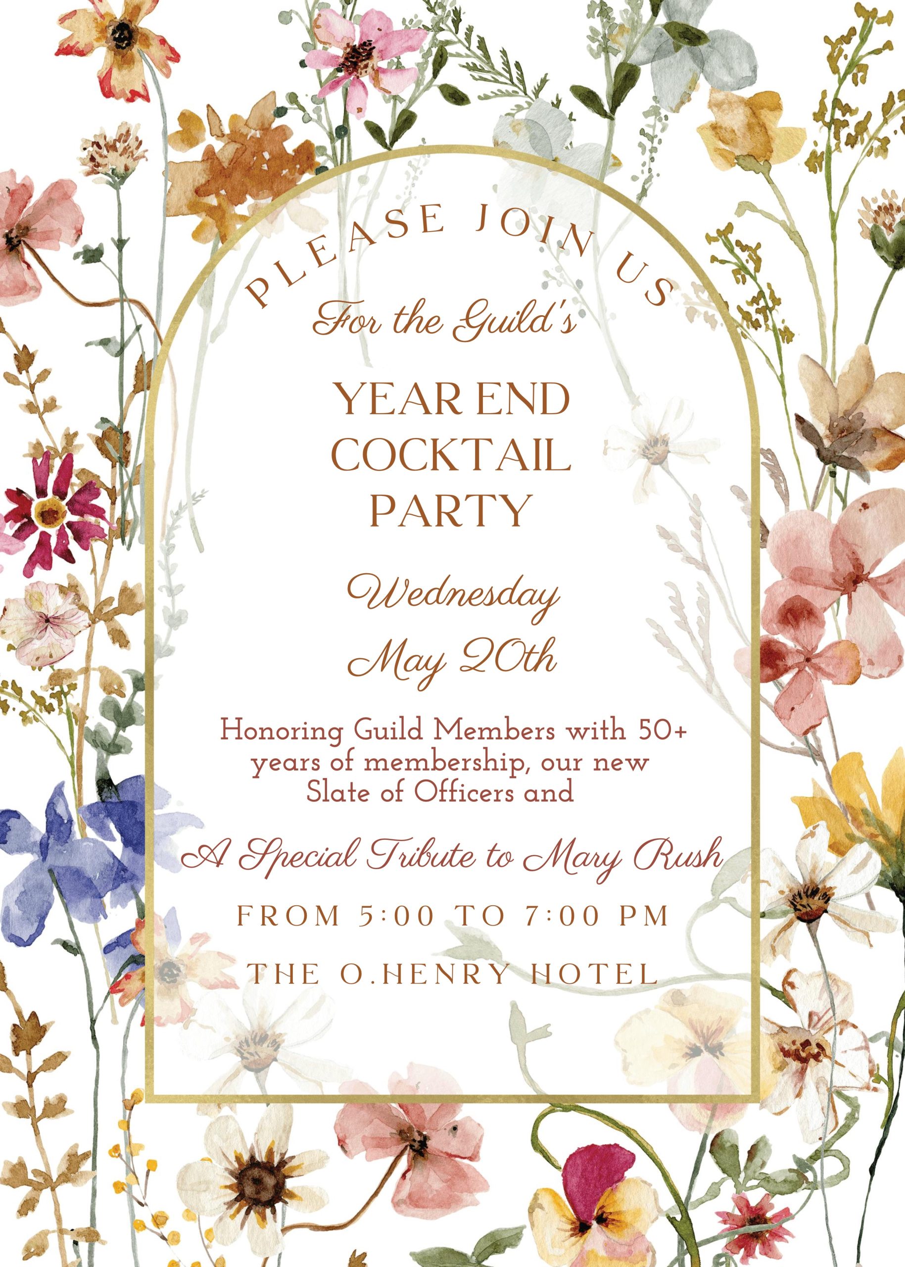 Date May 20 2026 Time 5:00 pm - 7:00 pm May 20 Guild Year-End Cocktail Party (RSVP deadline May 14th!) Share this event + Add to Google Calendar + iCal / Outlook export