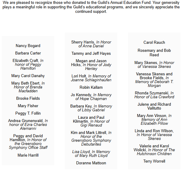 Thank you to our members who have generously donated to the AEC. Your contributions help support OrKIDStra, Lillian Rauch Beginning Strings, GSYO & Honors Quartet, and the Education Concerts.