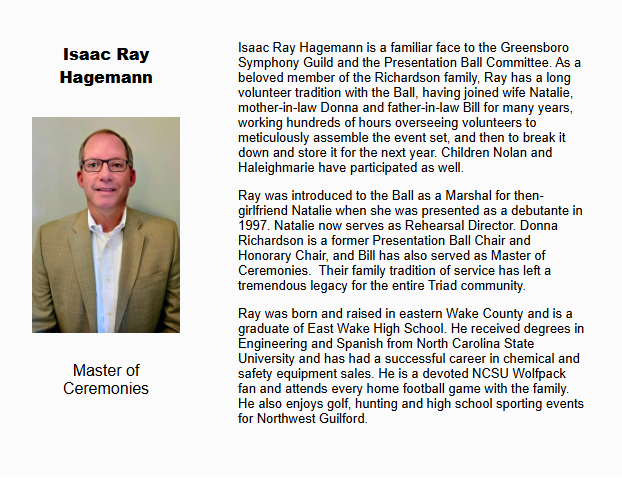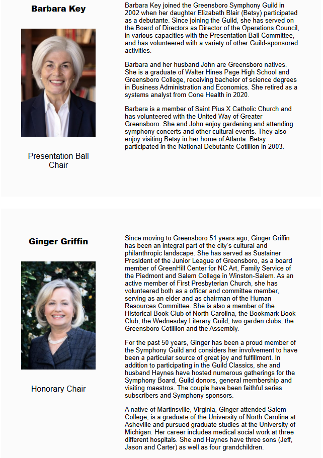 The Greensboro Symphony Guild has named Mrs. John Alan (Barbara) Key as Chair, Mrs. Haynes Glenn (Virginia) Griffin as Honorary Chair, and Mr. Isaac Ray Hagemann as Master of Ceremonies for the 49th Annual Symphony Presentation Ball.