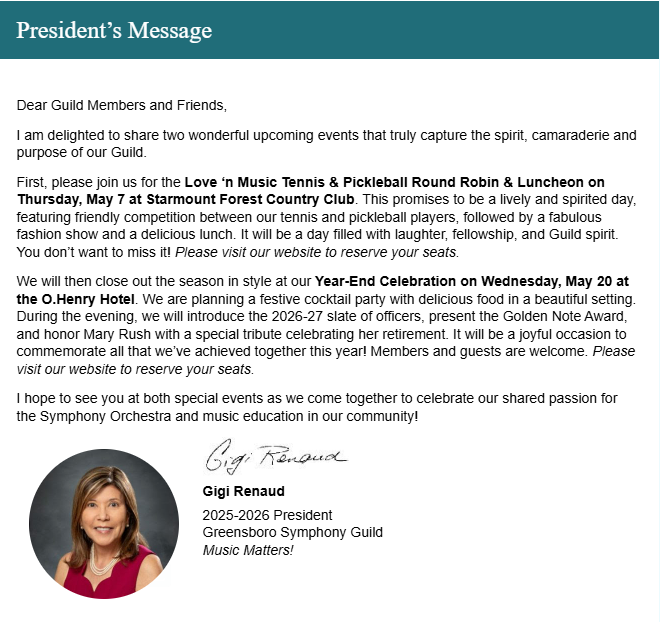 You don’t want to miss out on the Guild’s fun spring event – Love ‘n Music Tennis & Pickleball Round Robin & Luncheon on Thursday, May 7 at Starmount Forest County Club.